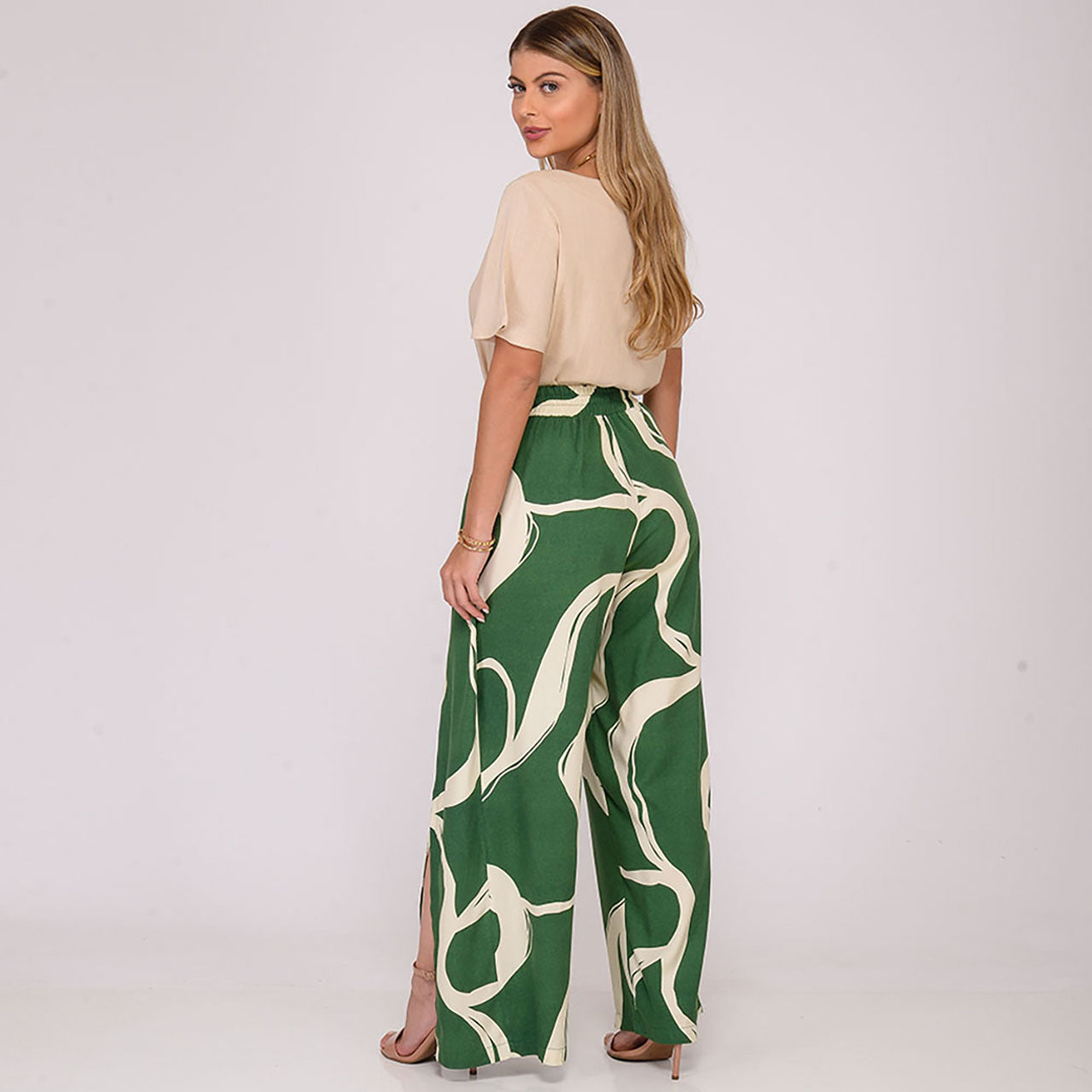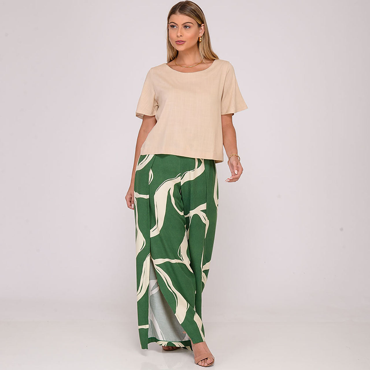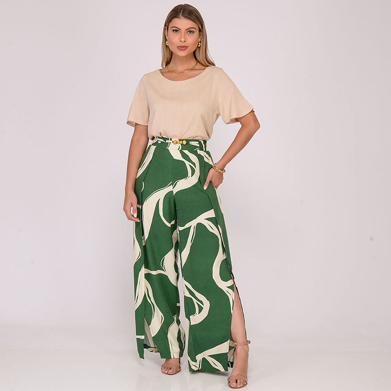 Confeccionada em viscose leve, esta pantalona traz pernas amplas e uma fenda frontal que valoriza o movimento e adiciona um toque moderno e ousado ao visual. O cós tem elástico embutido e detalhe decorativo que imita cinto, garantindo conforto e acabamento elegante. Não possui forro, mas o tecido tem ótimo caimento e não fica transparente.