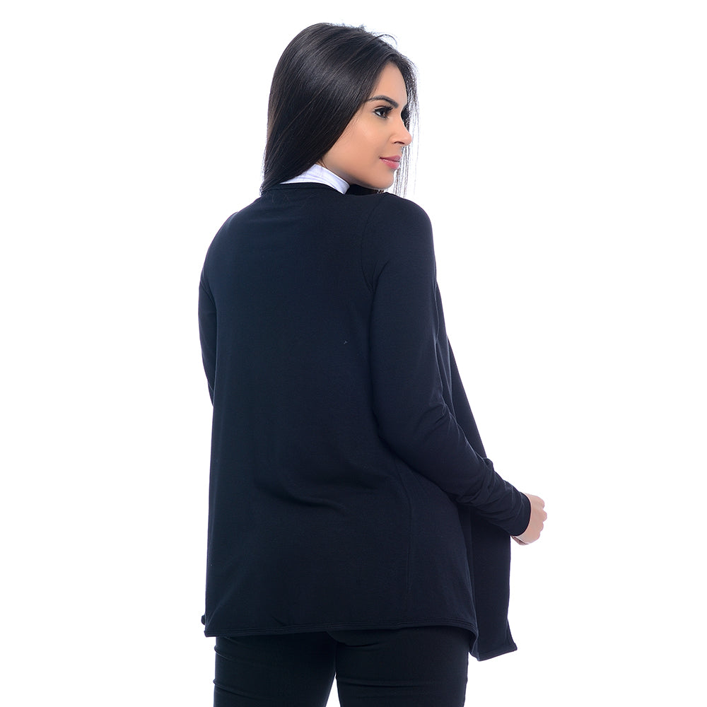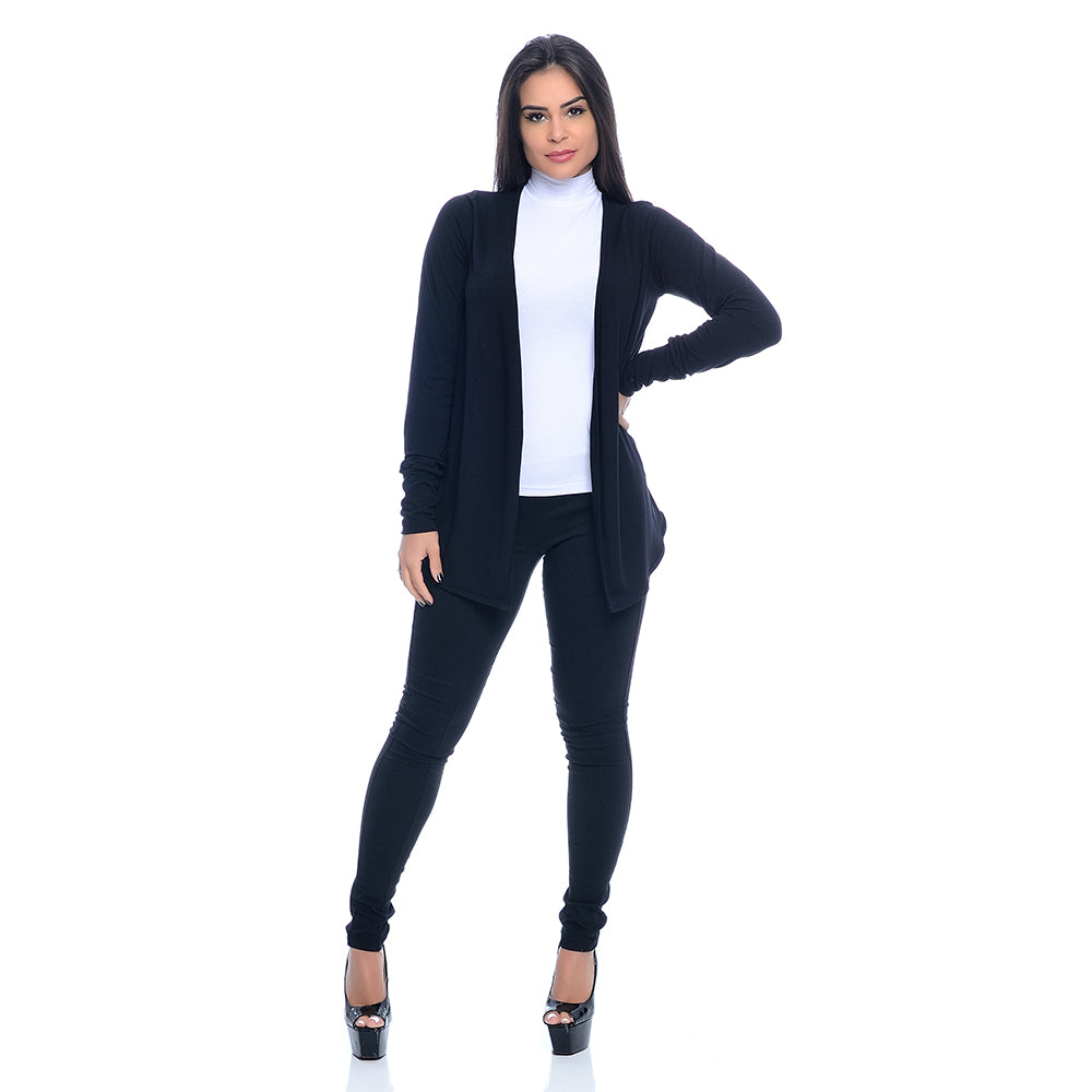 Cardigan confeccionado em viscolycra, tecido leve, macio e com caimento fluido. Modelo curto, com mangas longas e acabamento com detalhes nos punhos e na abertura frontal.