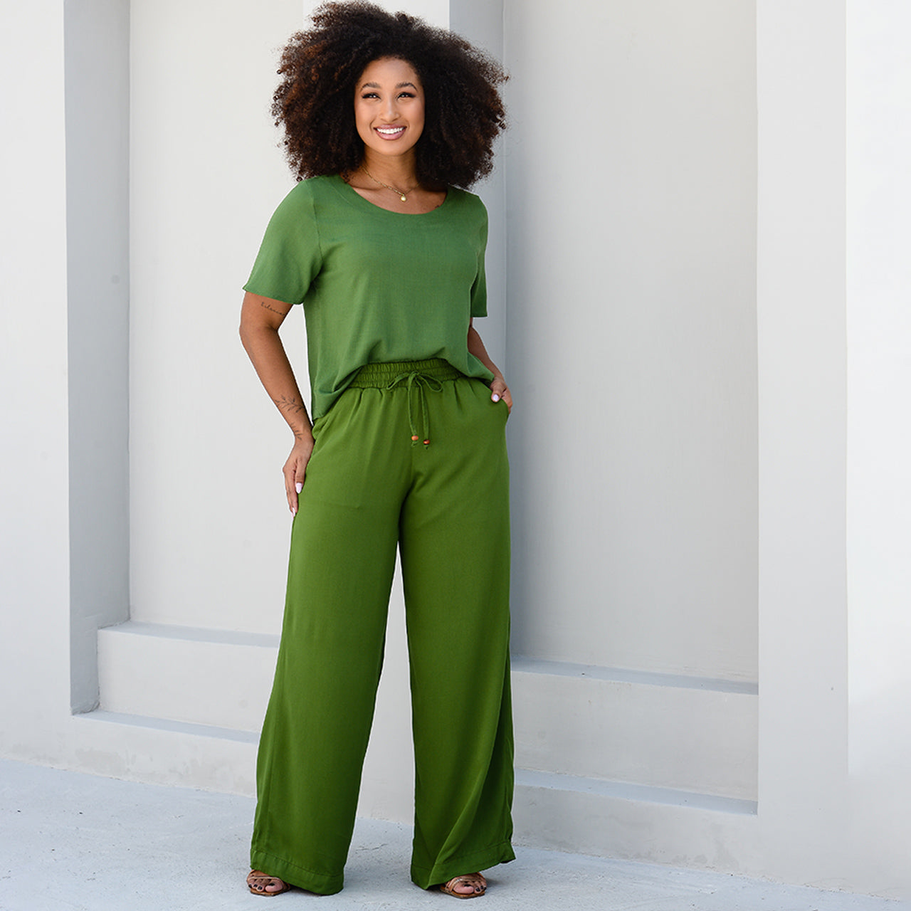 O Conjunto Leona é composto por blusa de manga curta em viscolinho e calça pantalona em viscose leve. A proposta tom sobre tom confere elegância contemporânea para usar em diferentes ocasiões – do passeio casual ao encontro mais especial.