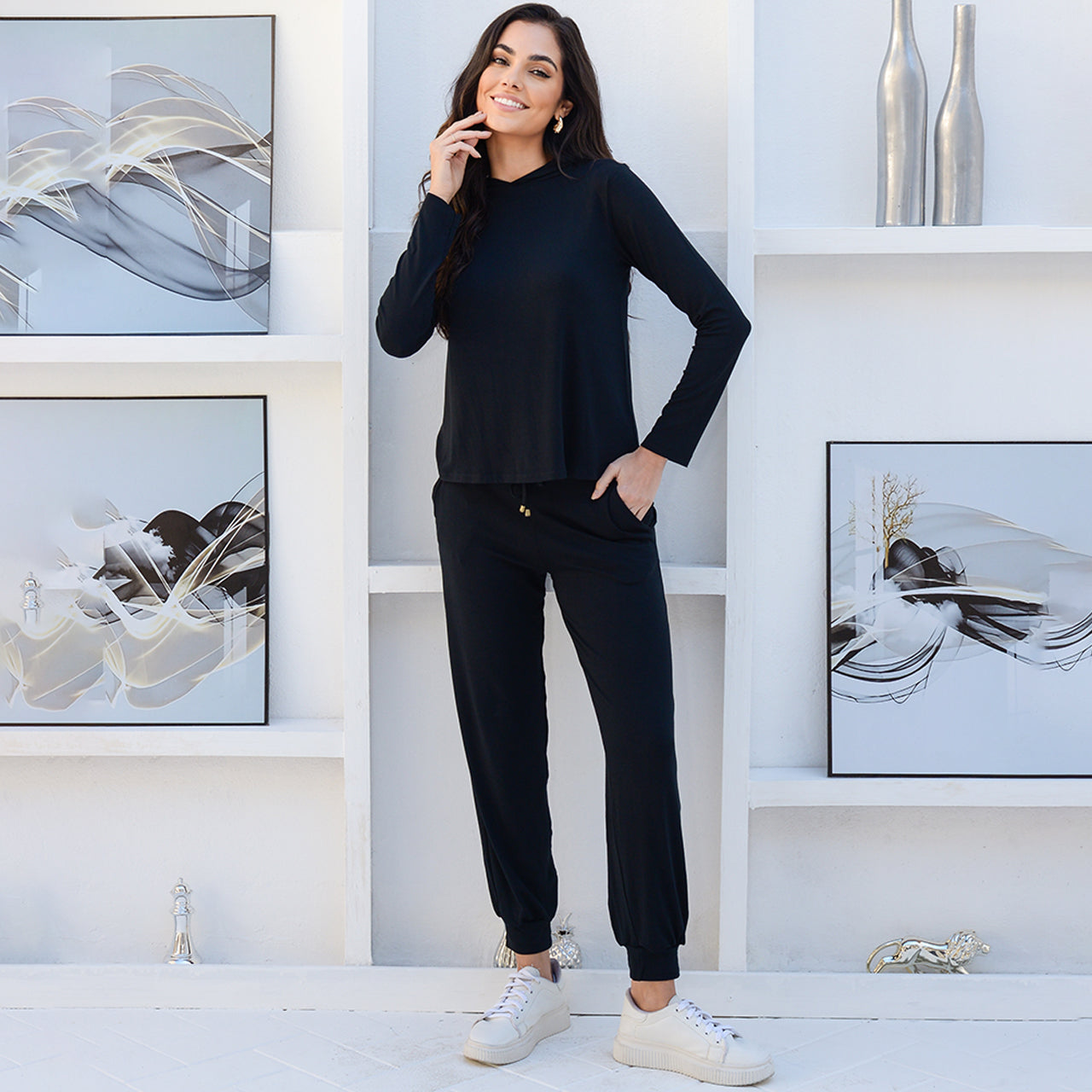 O Conjunto Suelen é composto por blusa com capuz, modelagem mullet (mais longa atrás) e mangas longas, além de calça jogger com punhos, cós anatômico com elástico, amarração frontal e bolsos. Feito em viscolycra, oferece caimento leve e toque macio – ideal para o dia a dia ou momentos de lazer.