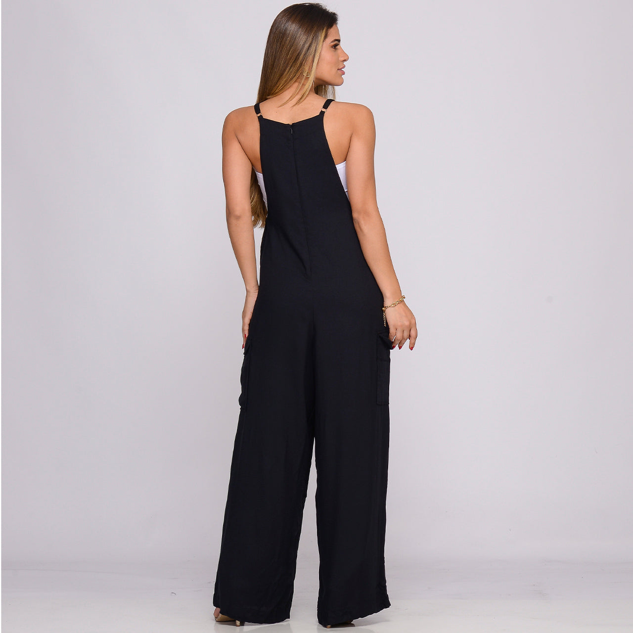 A Jardineira Liz tem comprimento longo, alças reguláveis, bolsos laterais e fechamento com zíper nas costas. O shape solto e o decote quadrado garantem conforto e liberdade para o dia a dia.