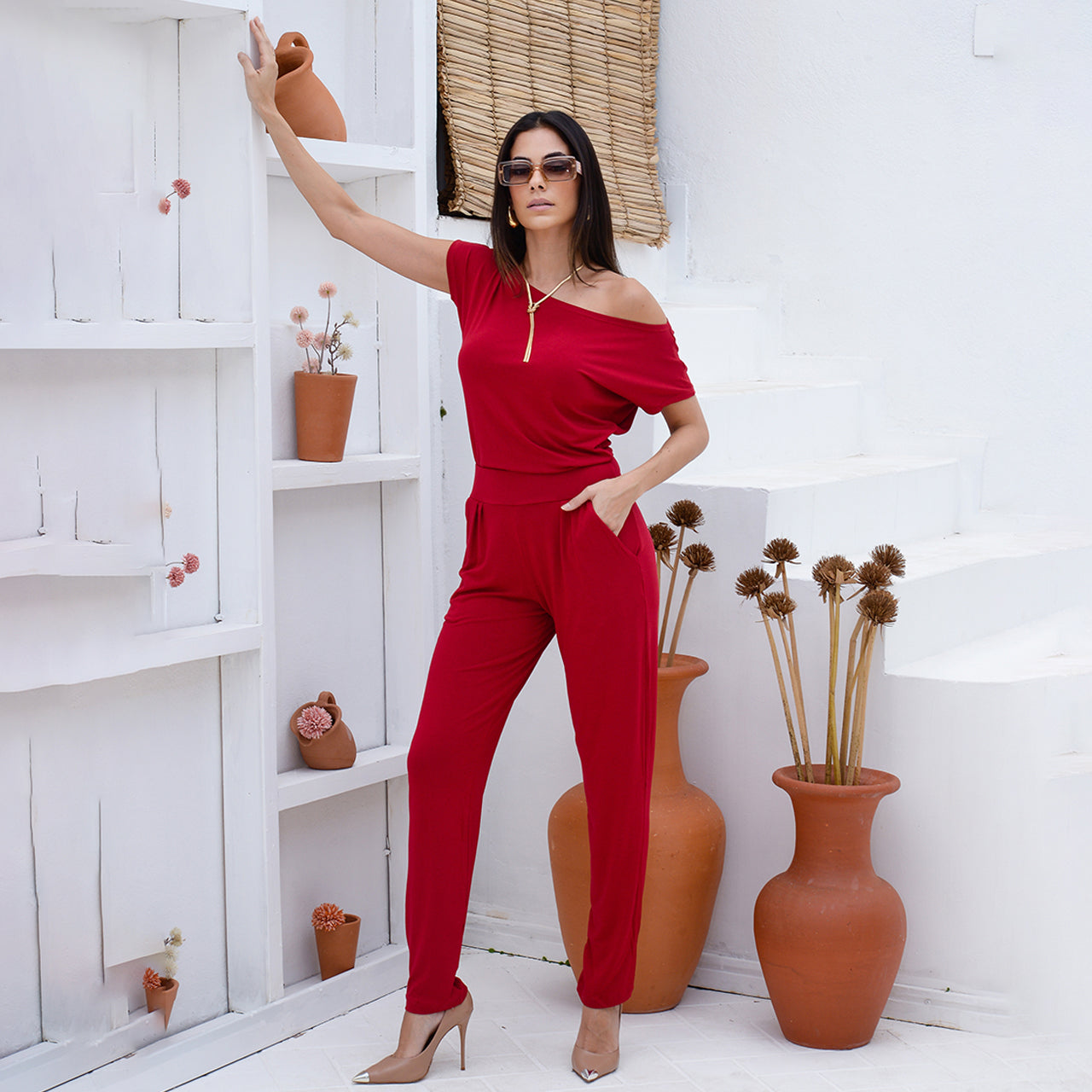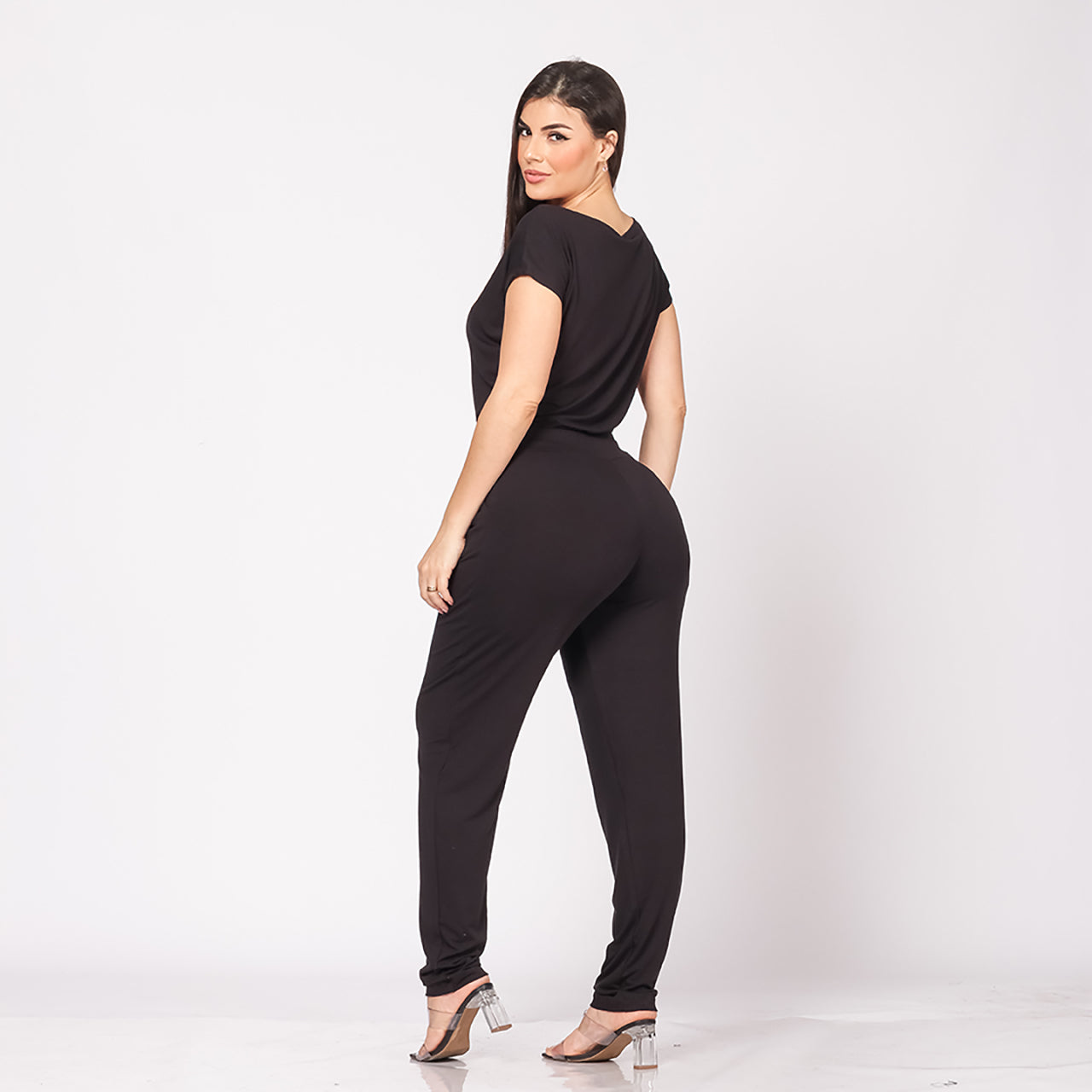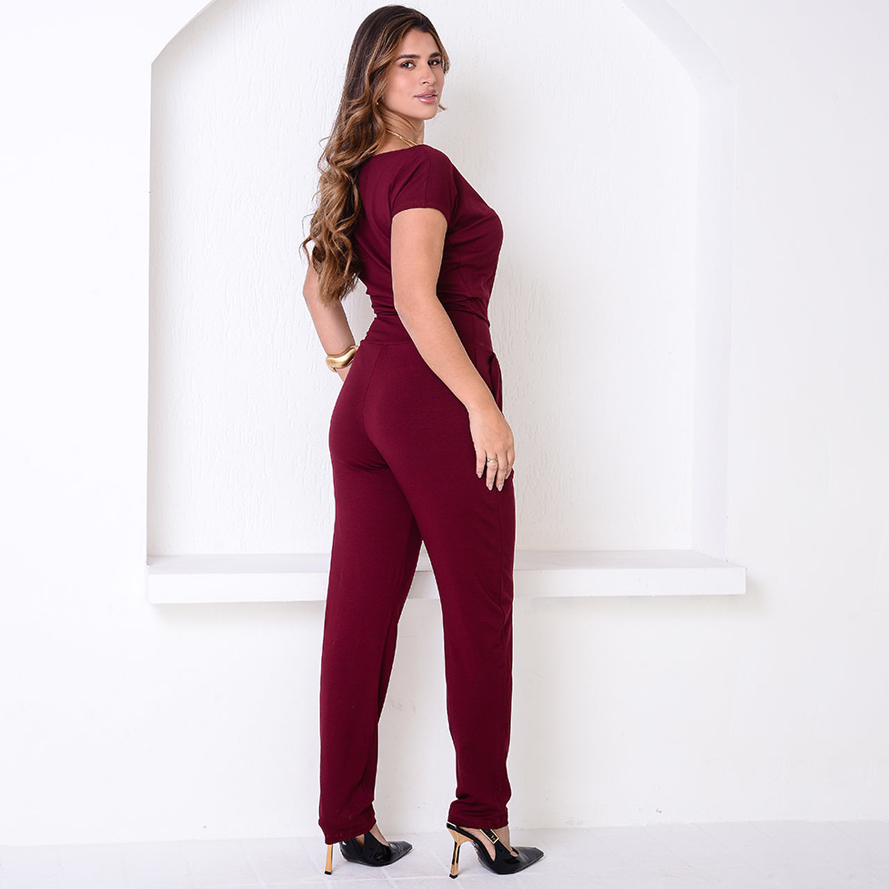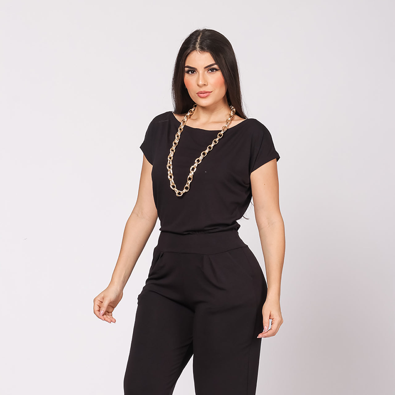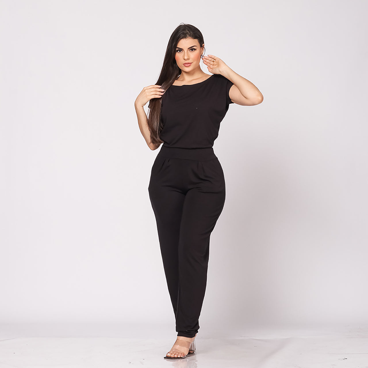 Confeccionado em viscolycra, o macacão possui mangas curtas, decote canoa, bolsos frontais funcionais e cós na cintura. Uma peça única que facilita a produção, oferecendo estilo e conforto em qualquer ocasião.
