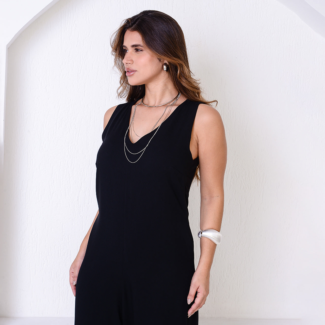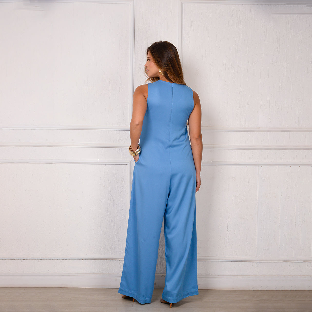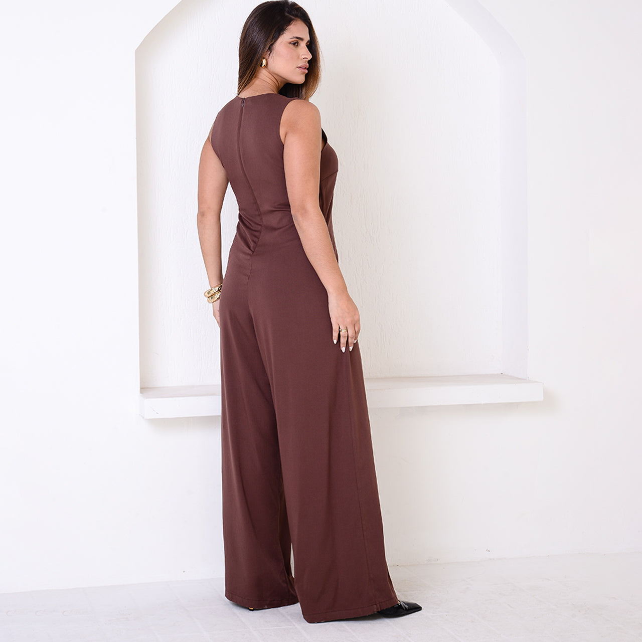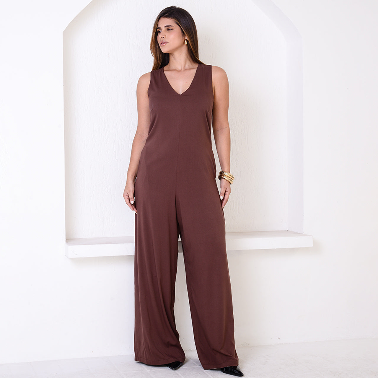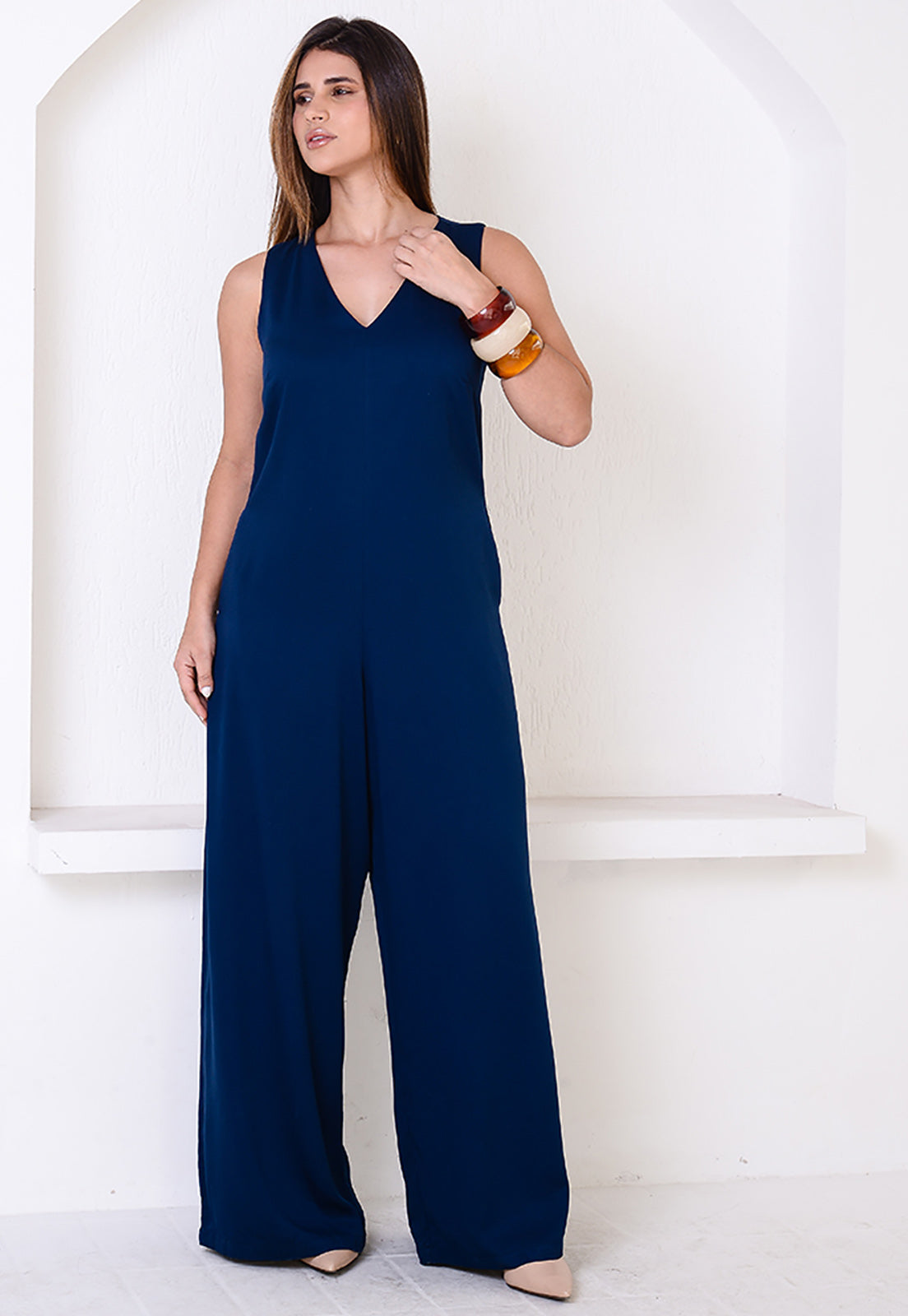 O Macacão Bianca é confeccionado em viscose leve, com modelagem pantalona, decote V, fechamento em zíper nas costas, bolsos laterais e caimento solto. Sem mangas, é ideal para dias quentes ou produções elegantes com blazer.