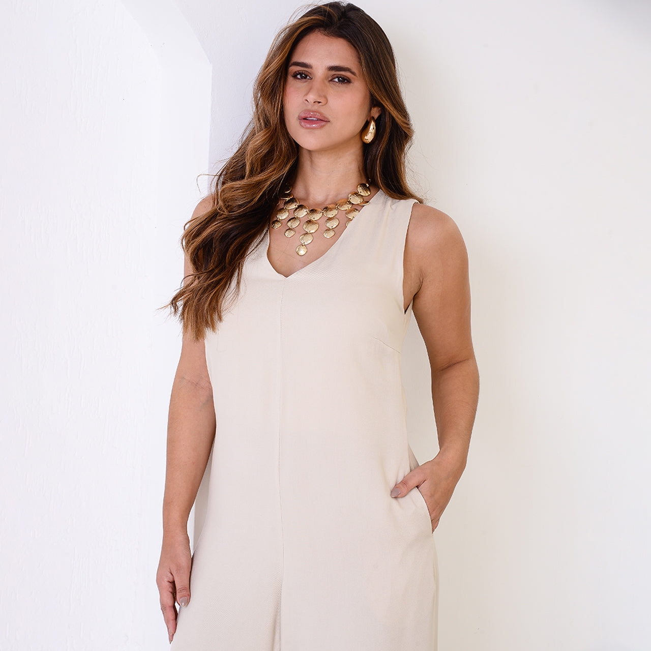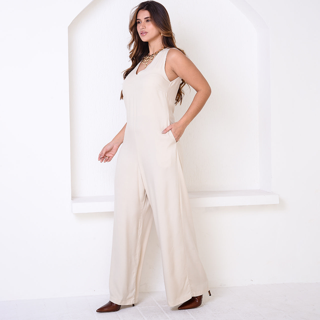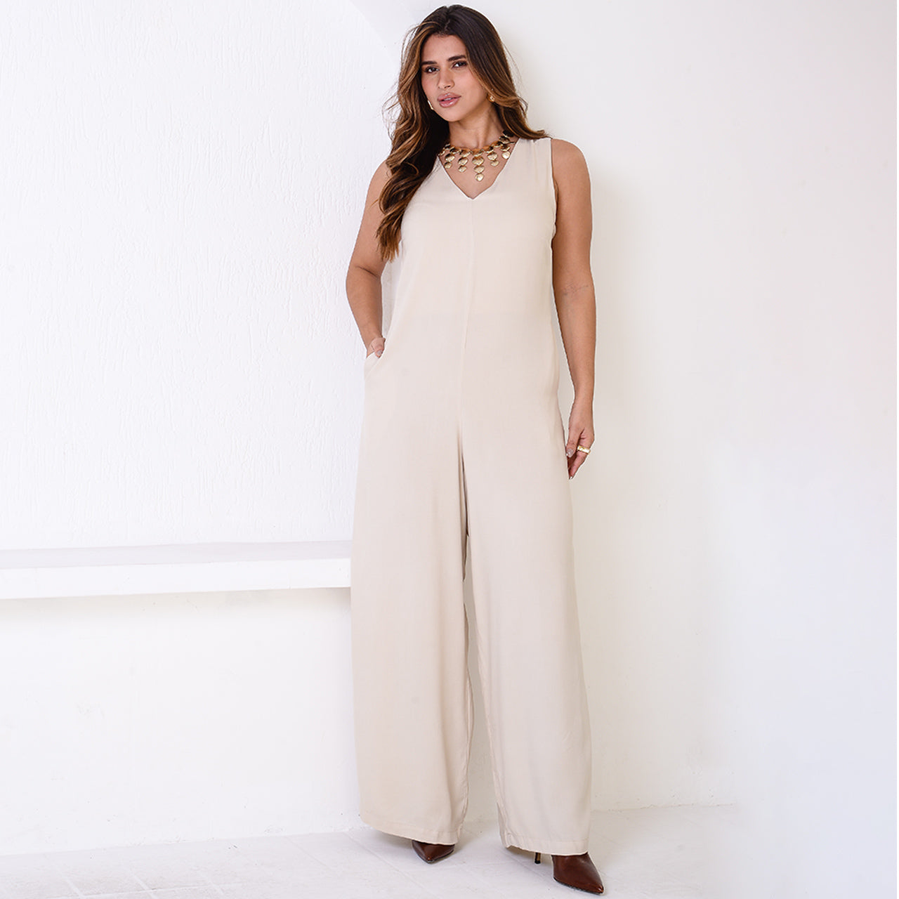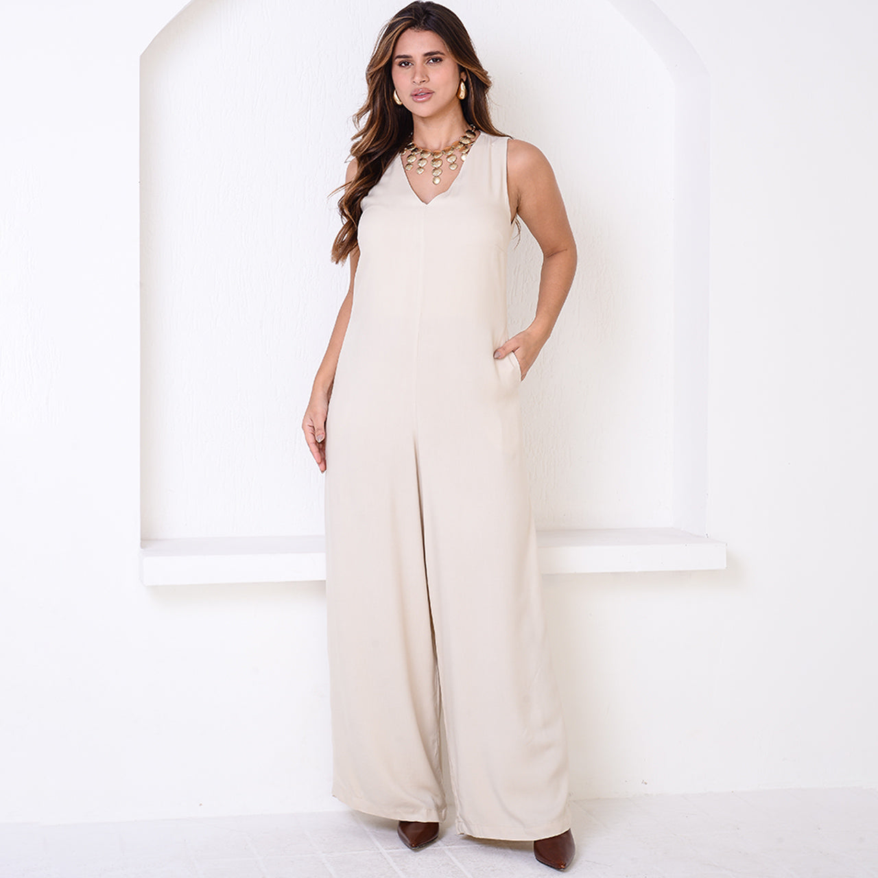 Macacão Pantalona Decote V BBonnie Bianca Bege