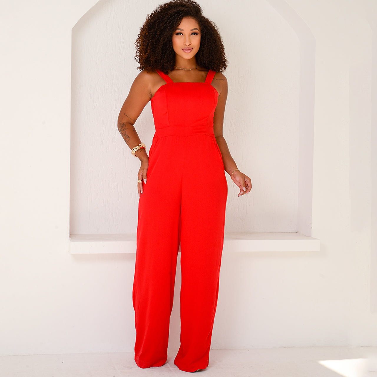 O Macacão Rafaela possui modelagem pantalona, decote reto, bolsos frontais e alças médias. O detalhe com lastex nas costas proporciona melhor ajuste ao corpo, enquanto o caimento solto garante leveza e sofisticação.