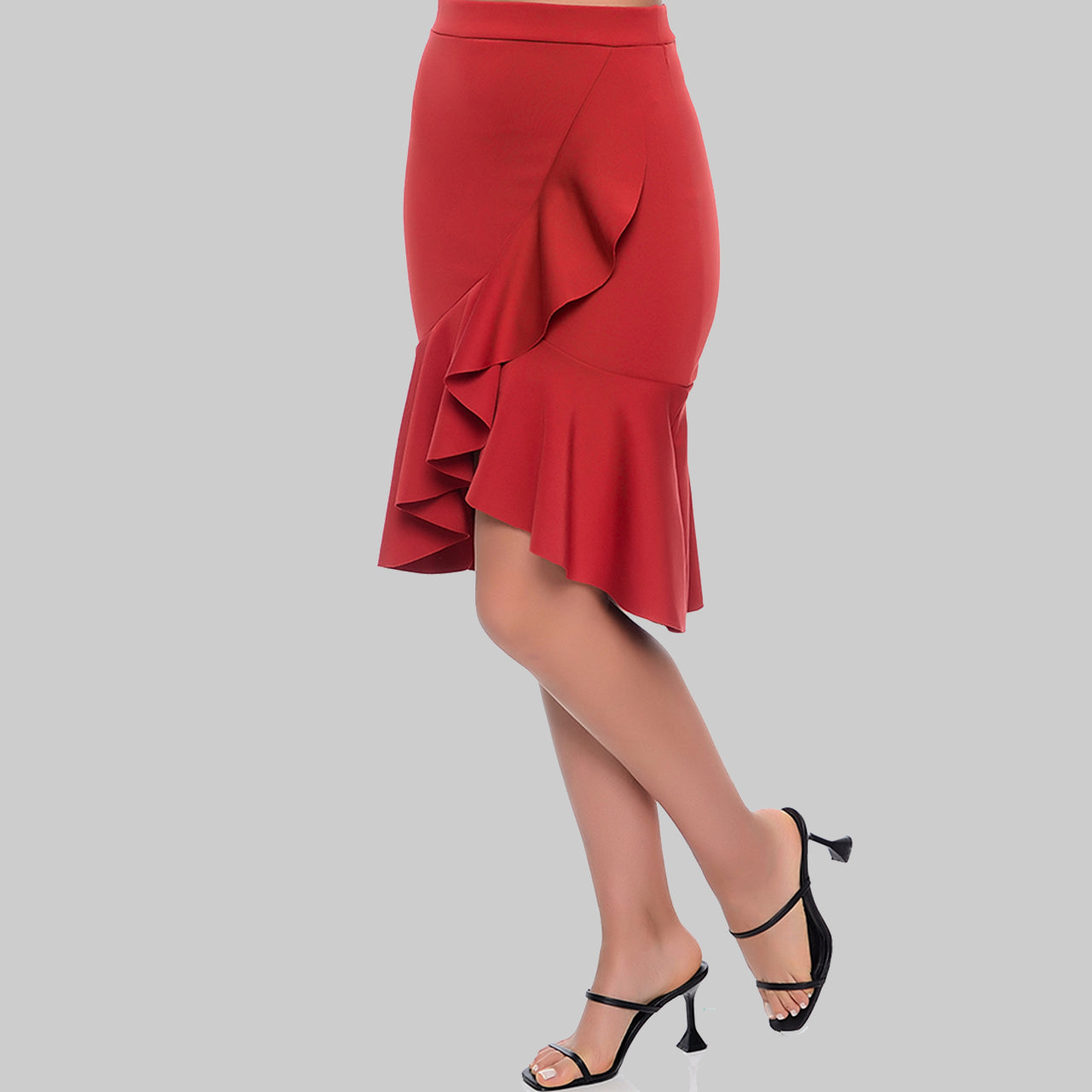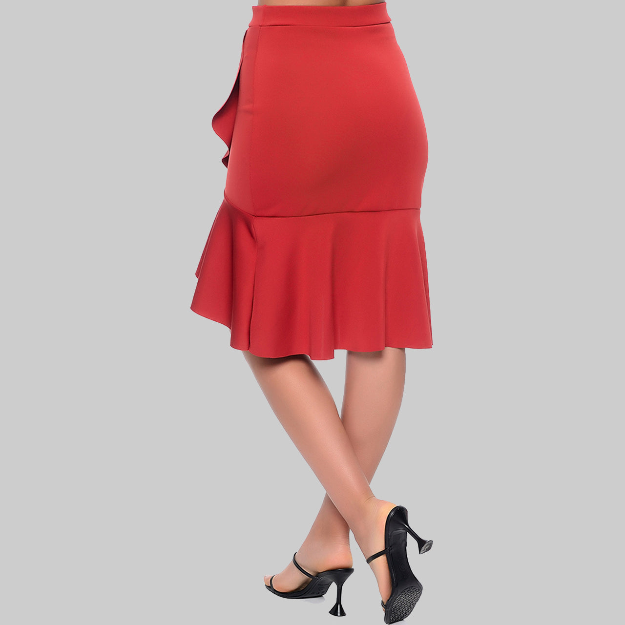 A peça é confeccionada em crepe leve, com toque macio e excelente caimento. Apresenta modelagem de cintura alta e cós médio, combinando babados delicados e fenda frontal para um efeito feminino e cheio de movimento. Versátil e elegante, transita com facilidade do dia a dia ao trabalho e a eventos descontraídos.