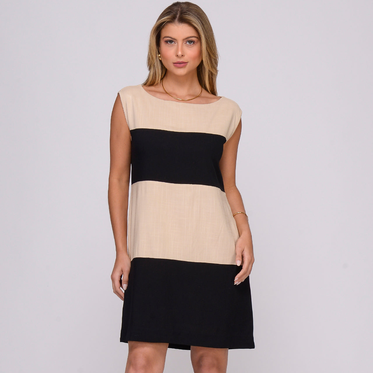 Estilo leve com toque moderno. Confeccionado em viscolinho, um tecido macio, fresco e com aparência elegante. Apresenta modelagem reta, comprimento curto, gola redonda e é sem mangas. O acabamento bicolor cria um visual atual e sofisticado, conferindo versatilidade para looks do dia a dia ou ocasiões especiais.