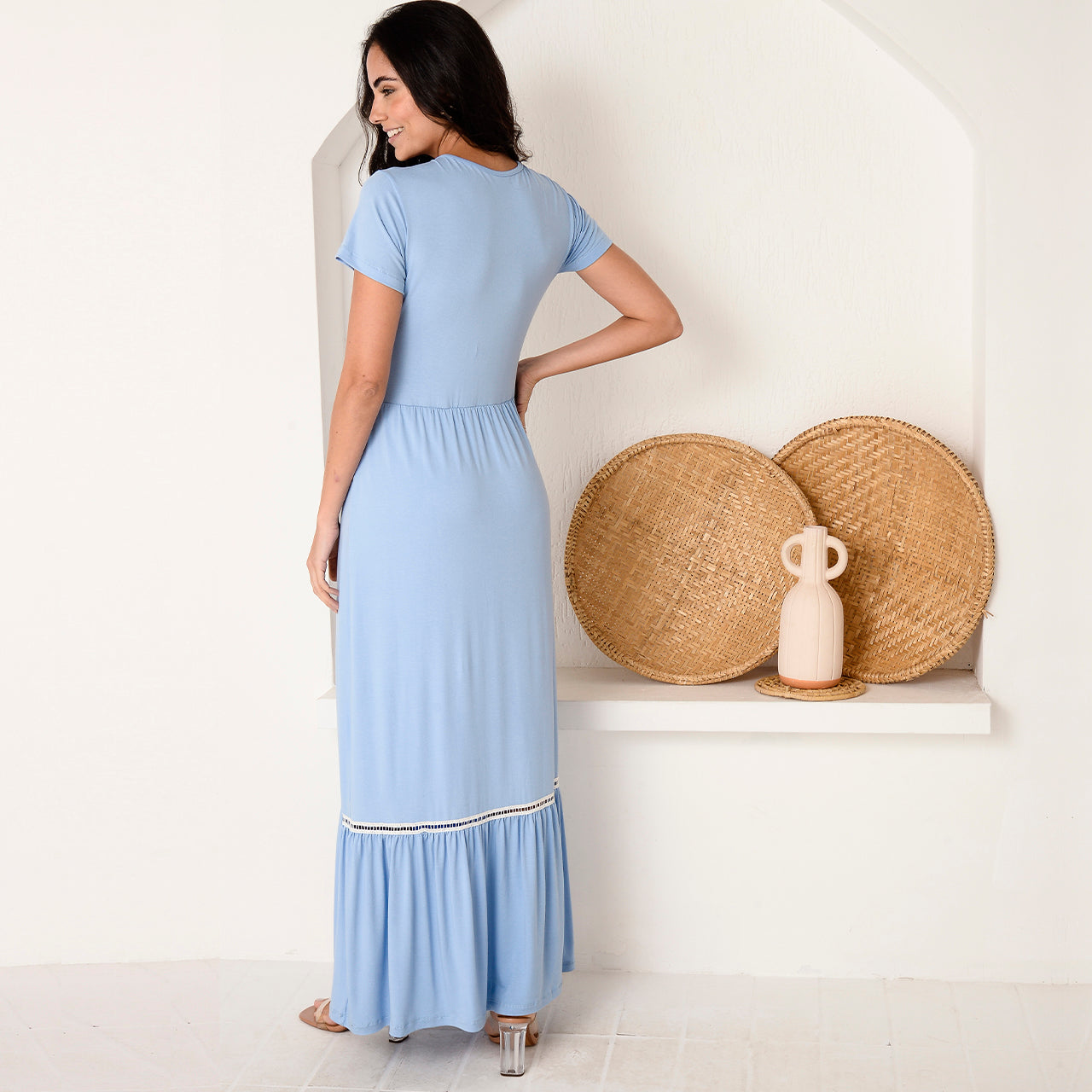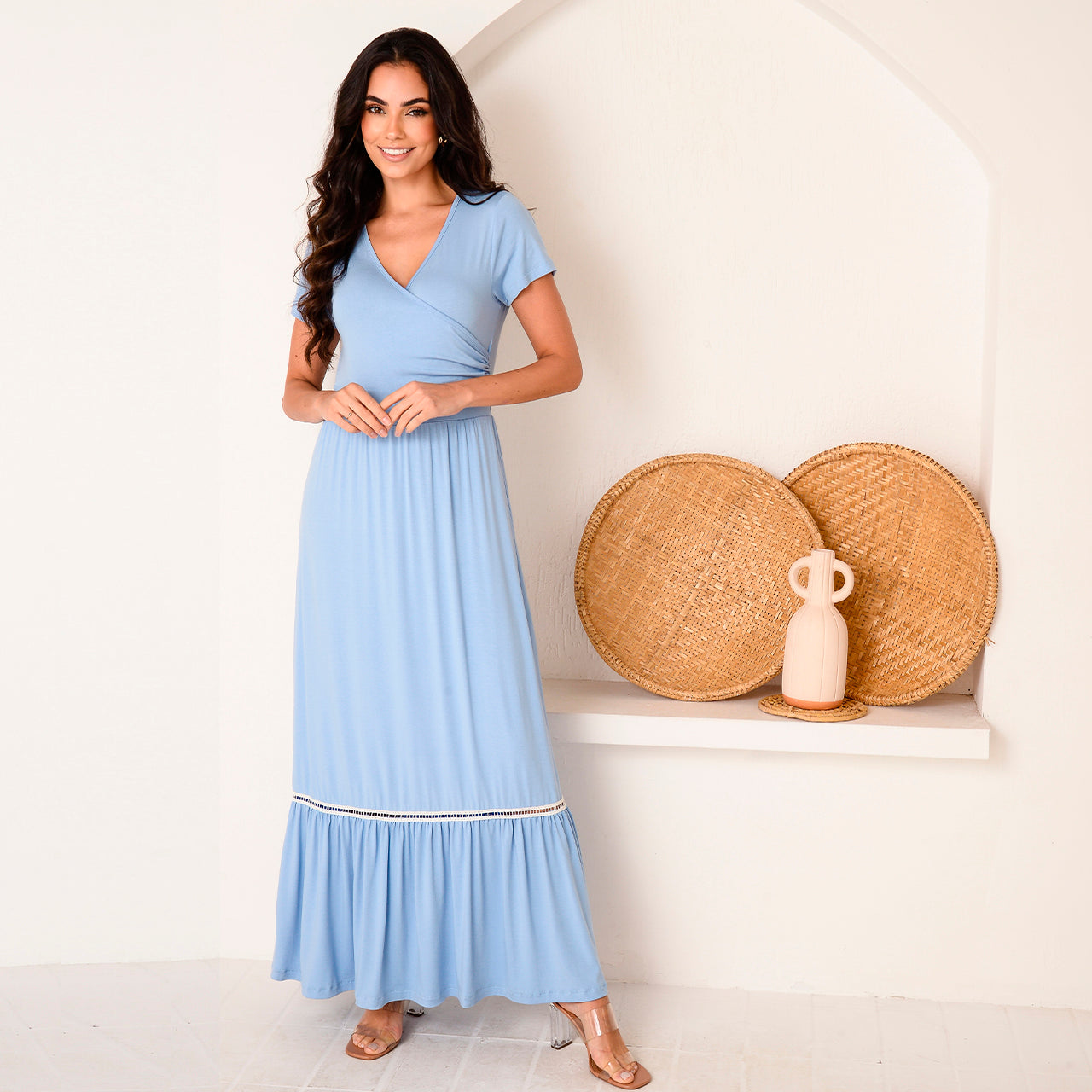 O Vestido Adriana é confeccionado em viscolycra e possui modelagem longa, busto marcado com decote transpassado, mangas curtas, barra rodada e detalhe guipir. Um modelo atemporal, leve e superconfortável que valoriza a silhueta com feminilidade.