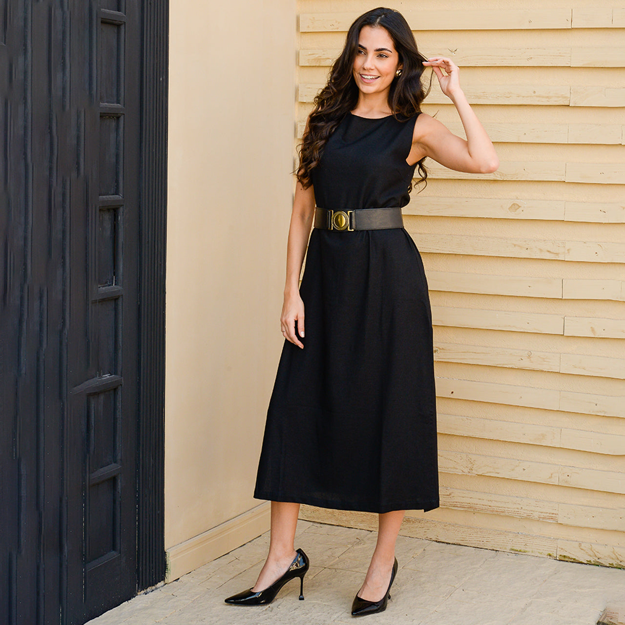 O Vestido Alice tem comprimento midi, modelagem levemente solta, decote redondo, alças largas, fendas laterais e bolsos. A combinação de viscose e linho garante frescor, caimento e conforto — ideal para looks descomplicados e cheios de charme.