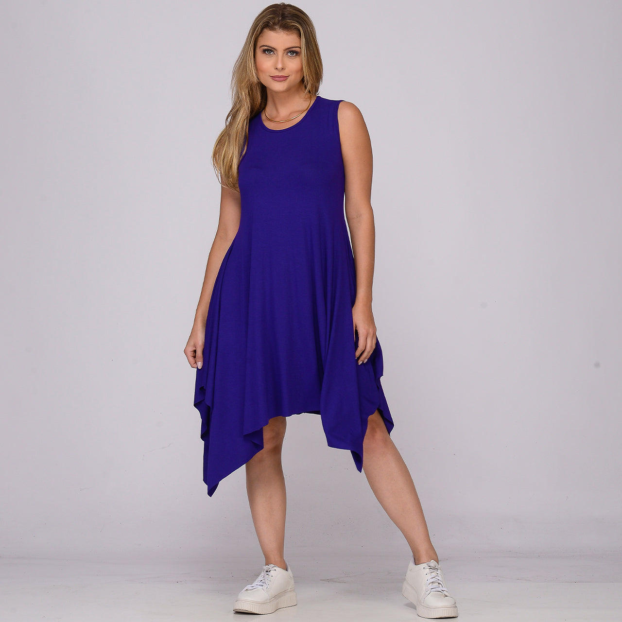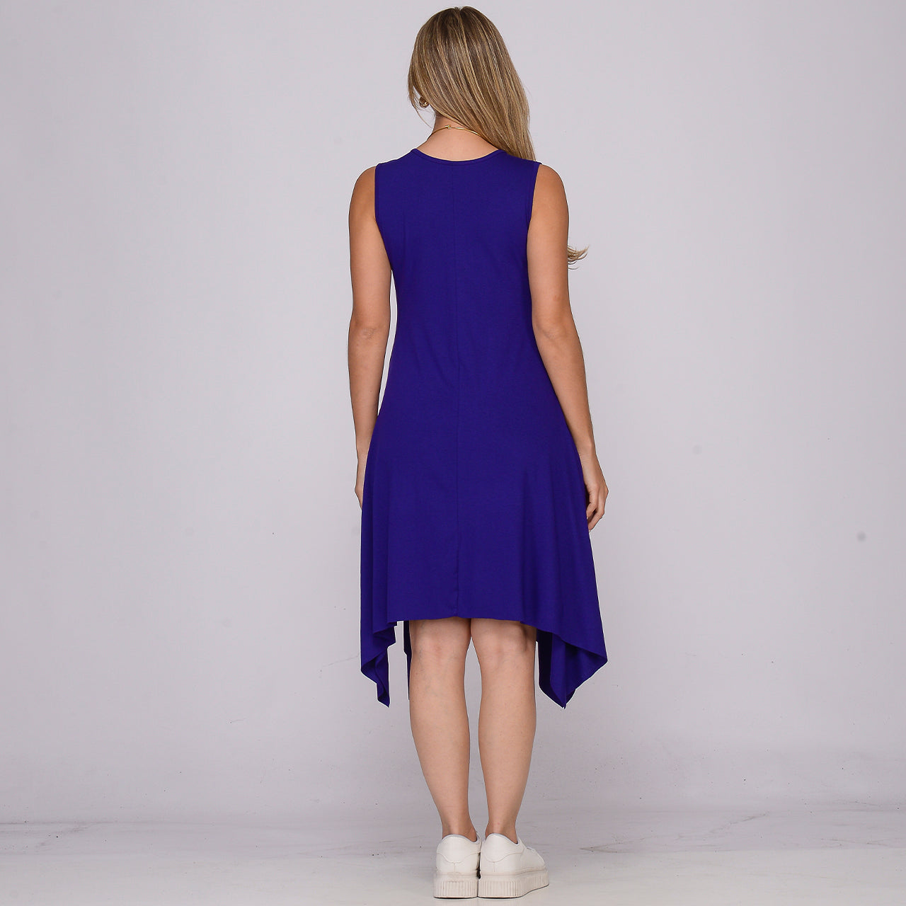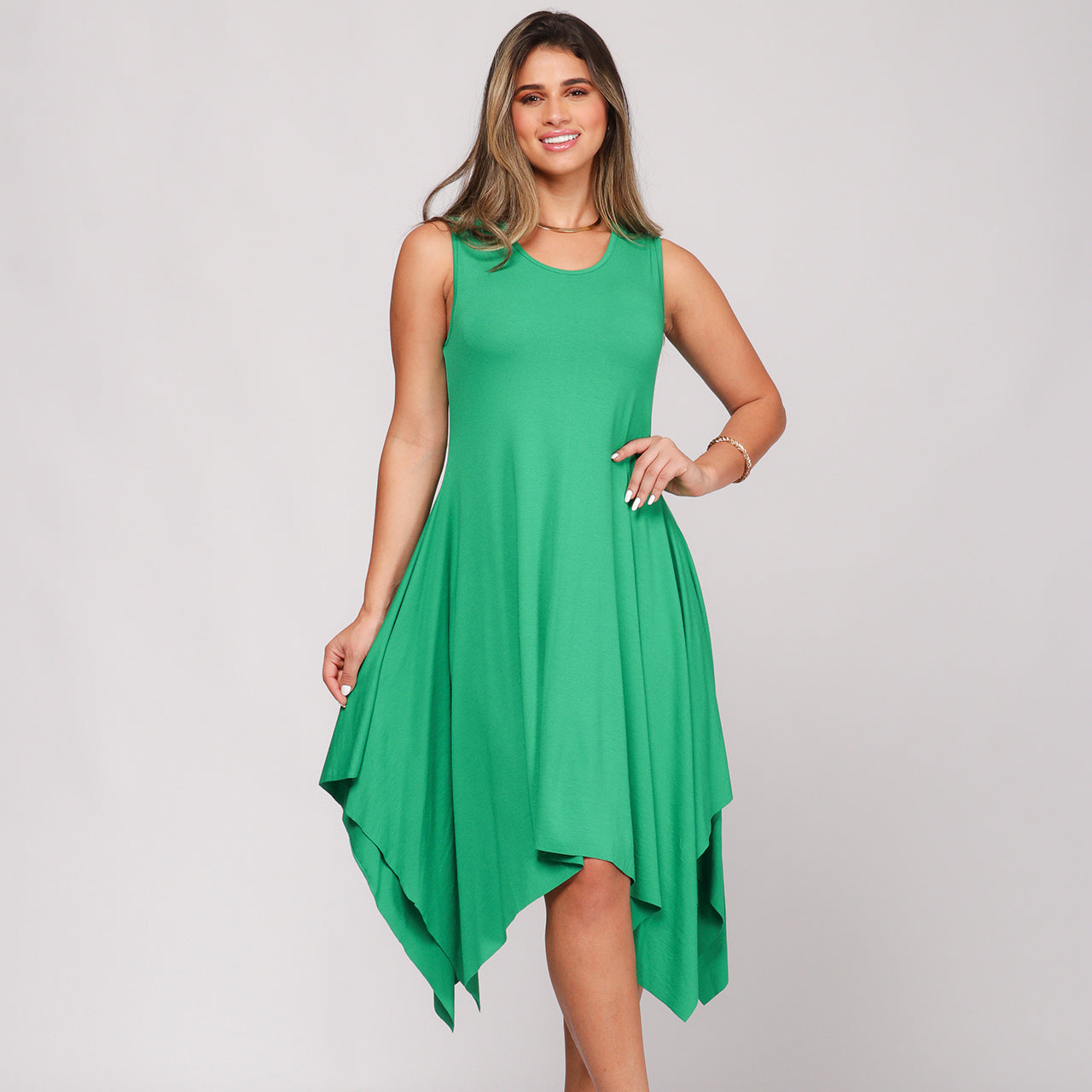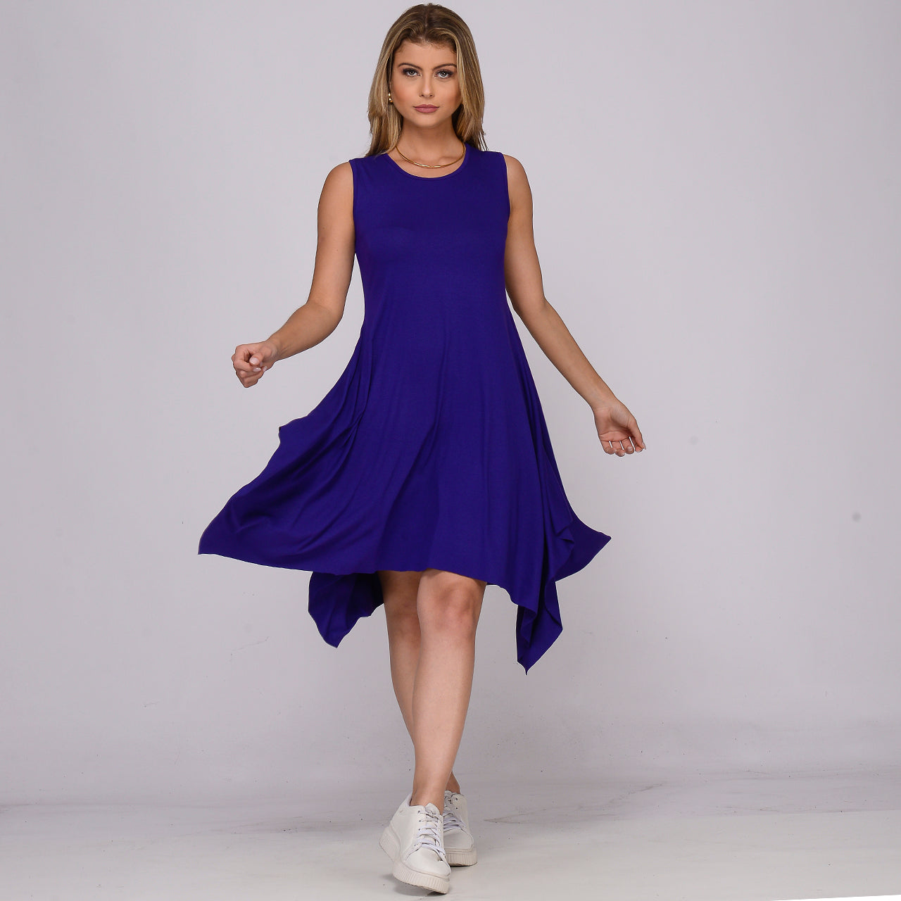 Este vestido possui modelagem evasê, comprimento midi com pontas assimétricas, decote redondo frontal e posterior, sem mangas e com saia ampla. O caimento solto e elegante valoriza a silhueta, oferecendo movimento, conforto e um acabamento fluido graças à viscose com toque macio e o leve elastano.